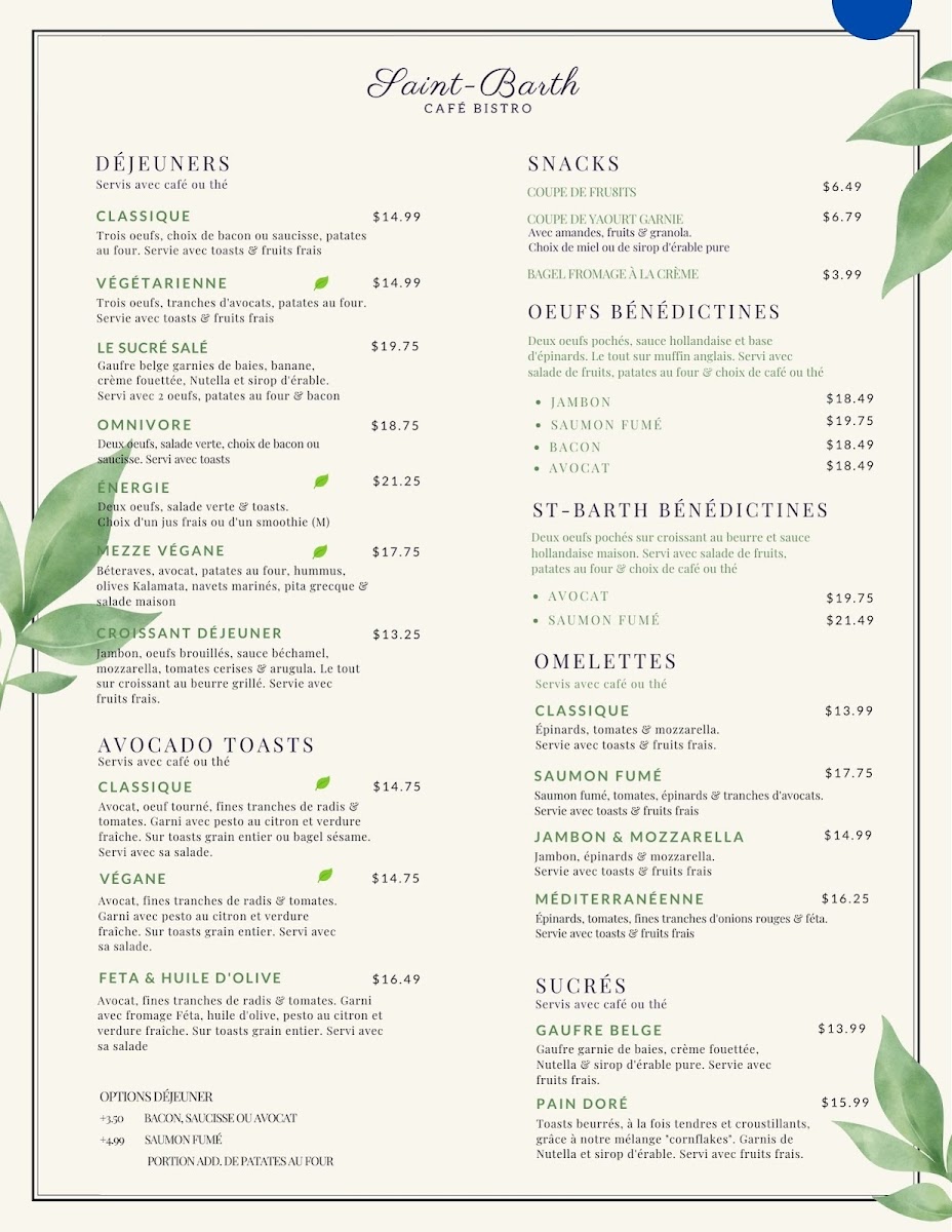 Welcome to Café St-Barth - Breakfast, a delightful brunch spot nestled in the heart of Montreal. The menu is a culinary homage to classic breakfast fare with a refined twist. Begin your day with their exquisite Baguettes, featuring herby grilled chicken, rich pesto with brie, or traditional ham and cheese, all priced at CA$14.75.